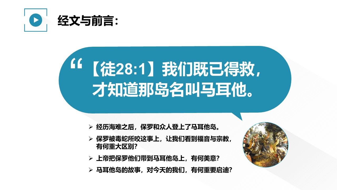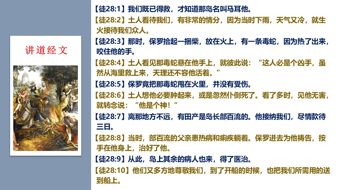 《使徒行传》28章,经历海难之后,保罗和众人登上了马耳他岛。