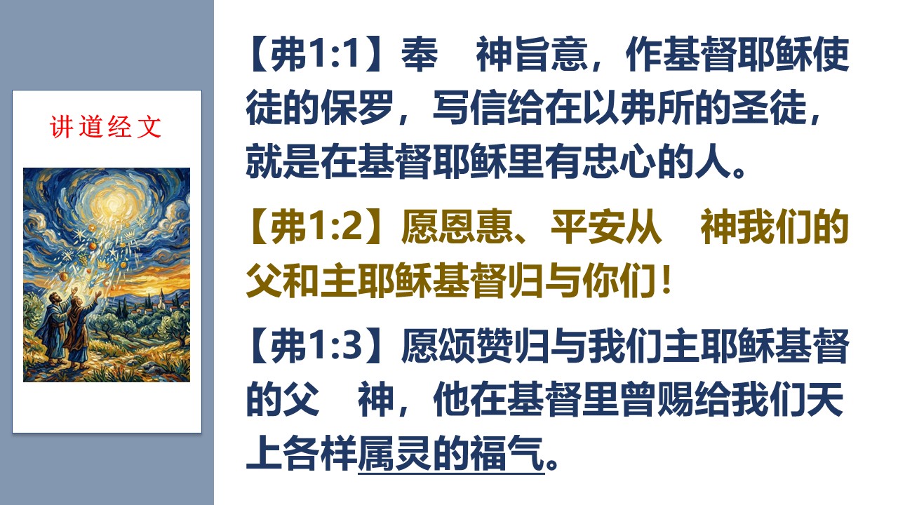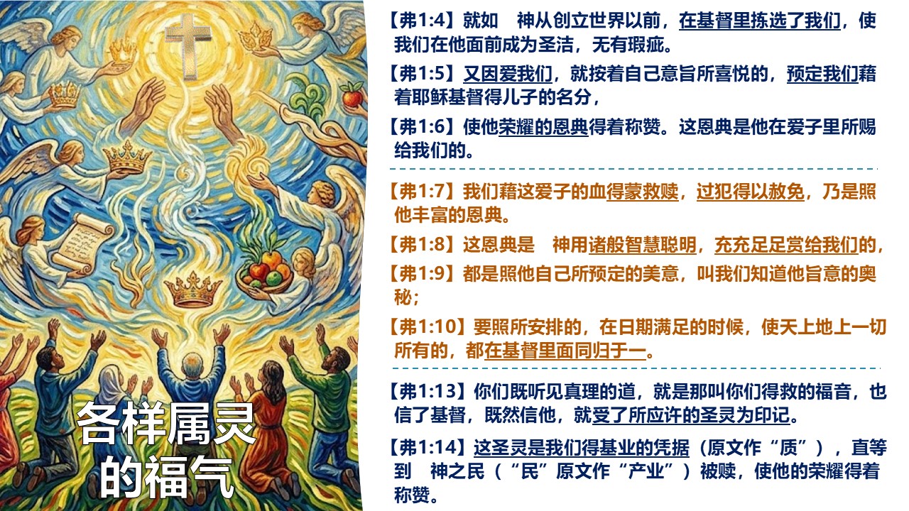 在以弗所书里,保罗第一次赞美神,是因祂赐福给我们“各样的属灵福气”。